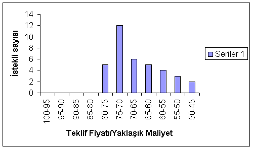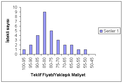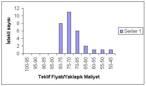 Tablo 4’te görüldüğü gibi otuz teklifin dokuz adedi yani %30’u yaklaşık maliyetin %80’i içinde, on dört adedi yani%46’ı yaklaşık maliyetin %80’i ile %60’ı arasında, yedi adedi yani %23’ü yaklaşık maliyetin %60’ı ile %45’i arasında herhangi bir bölgede kümelenmeden homojen bir dağılım göstermektedir.